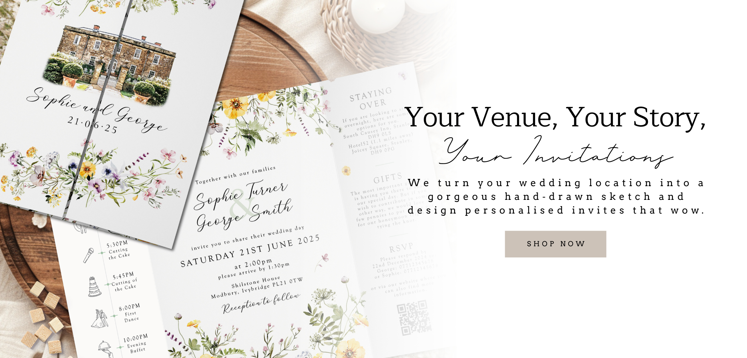 For their wedding day… a card they’ll never throw away. Featuring a hand‑drawn sketch of their venue, ready to frame and keep forever.