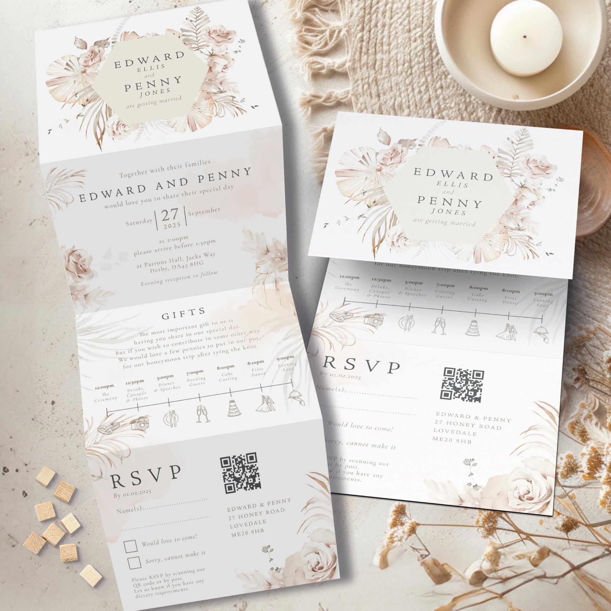 Bring effortless elegance to your special day with these neutral floral boho wedding invitations. Featuring soft earthy tones and delicate botanical details, this design captures the natural beauty of a bohemian celebration. Perfect for rustic, outdoor, or modern boho weddings, these invitations blend timeless charm with free-spirited style - creating the perfect first impression for your guests.