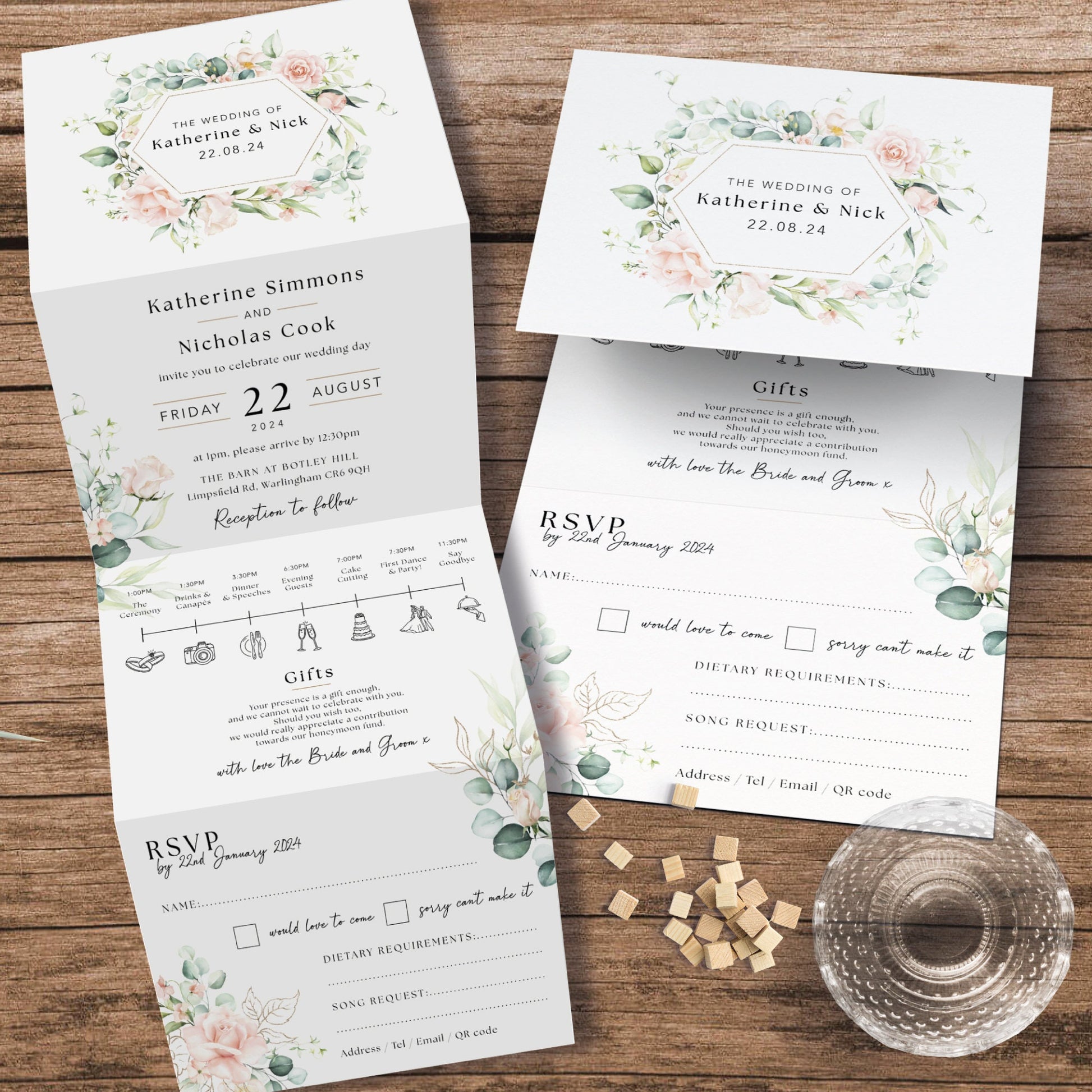 Make a lasting impression with these blush foliage concertina wedding invites, featuring a stunning combination of elegant greenery and soft floral accents. Designed as a folded concertina-style invitation, this all-in-one design is perfect for rustic, boho, and romantic weddings. Personalise with your wedding details and wow your guests with a beautifully crafted wedding suite!