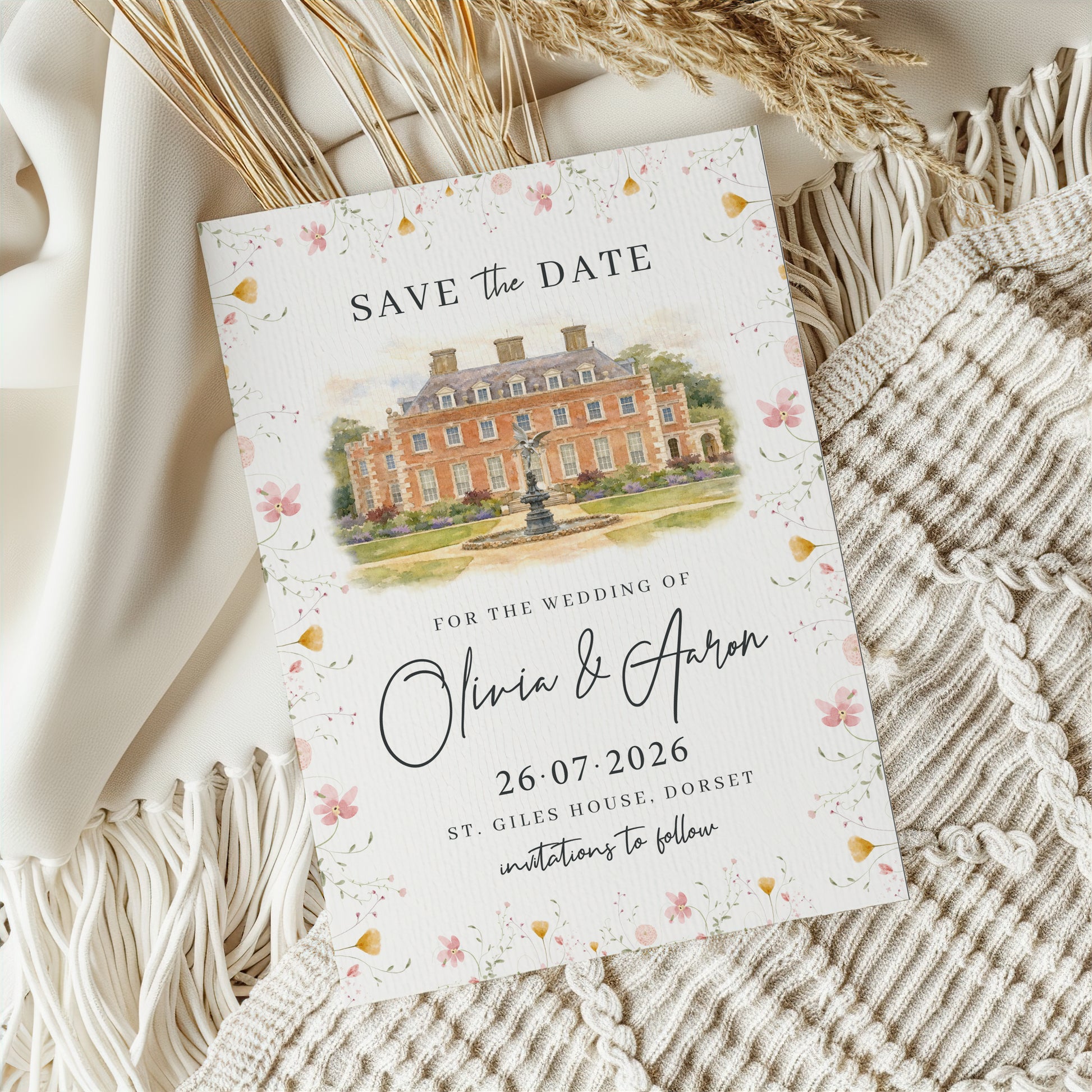 Watercolour venue sketch save the dates - personalised wedding cards featuring your venue in a beautiful illustrated style.