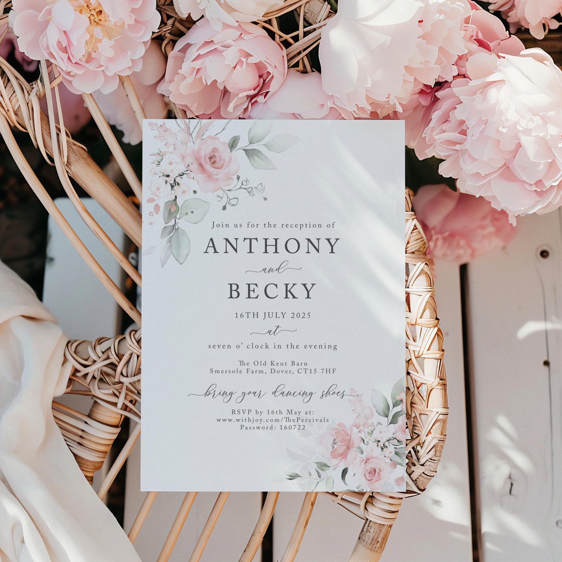 Set the tone for your wedding with our pale blush floral invitations, a perfect blend of soft pink hues and delicate foliage. This design is ideal for couples seeking a romantic, timeless, and understatedly elegant look for their wedding stationery.