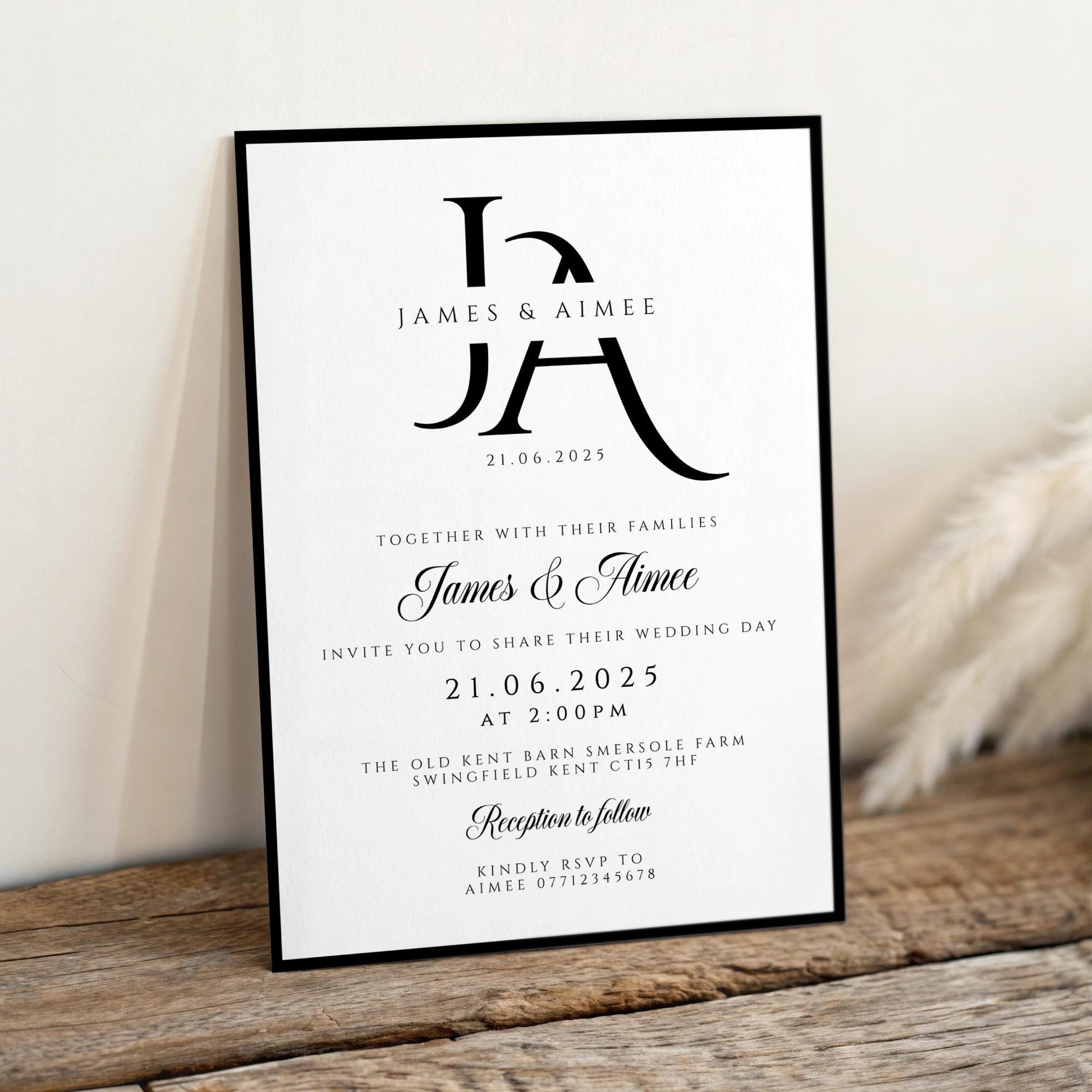Timeless Black & White Wedding Invitations Make a bold, elegant statement with our black and white wedding invitation suite. This clean, modern design pairs high-end simplicity with fully customisable details to reflect your personal style.