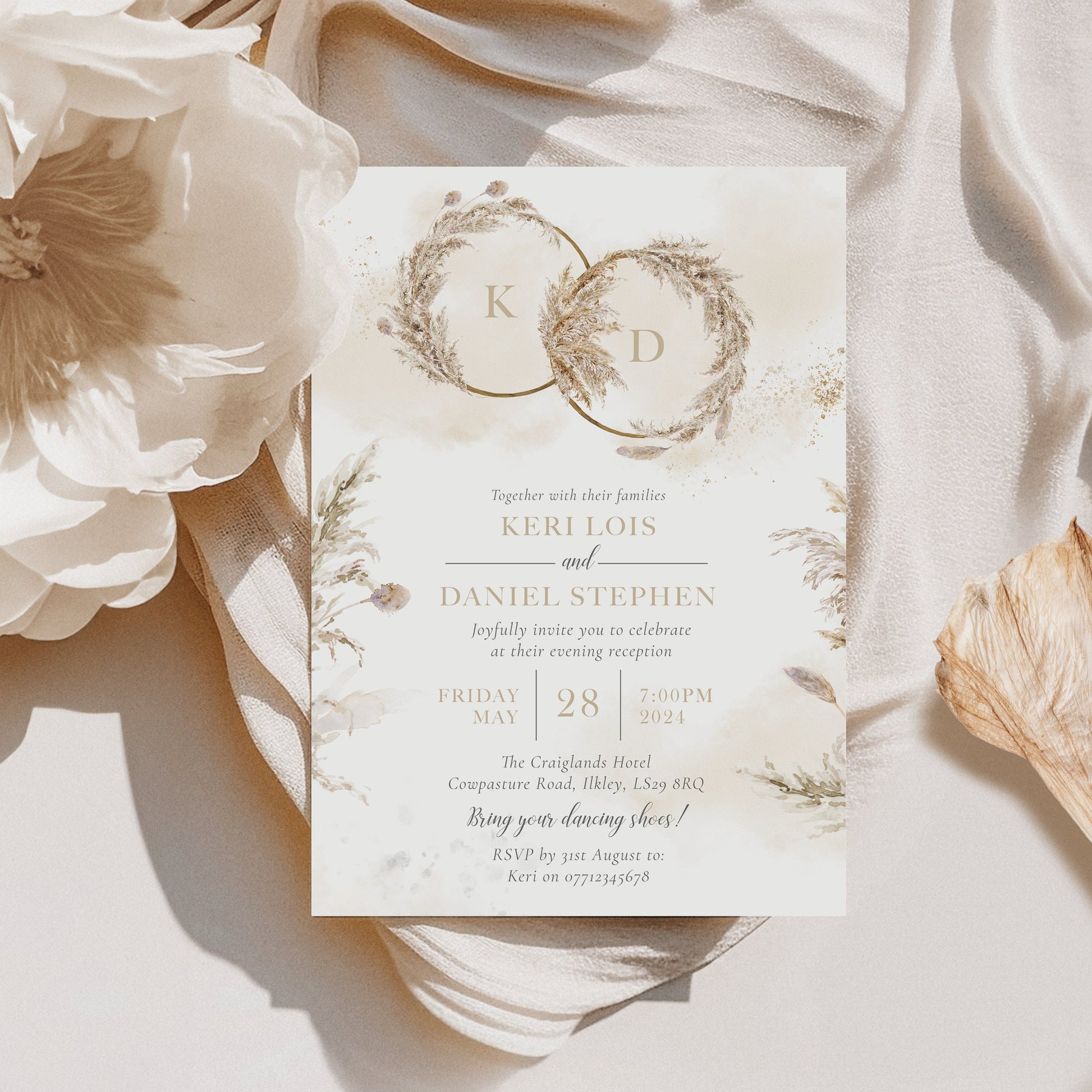 Pampas Grass Wedding Invitations, Rustic Wedding Invites with Neutral Tones