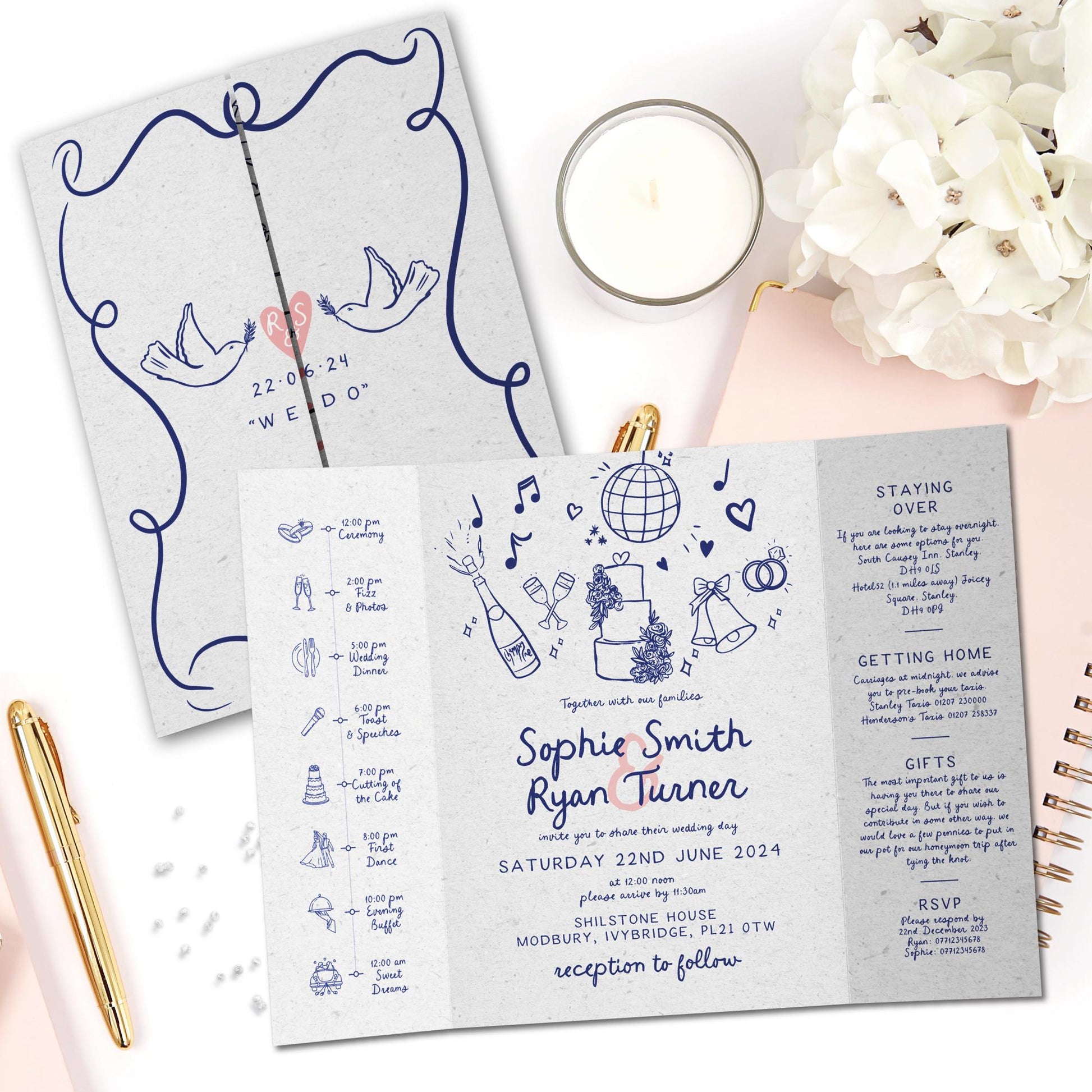 Blue Hand Drawn Wedding Invitations, Fun Doodle Wedding Invitation, Scribble Wedding Invites, Unique and Modern Gatefold