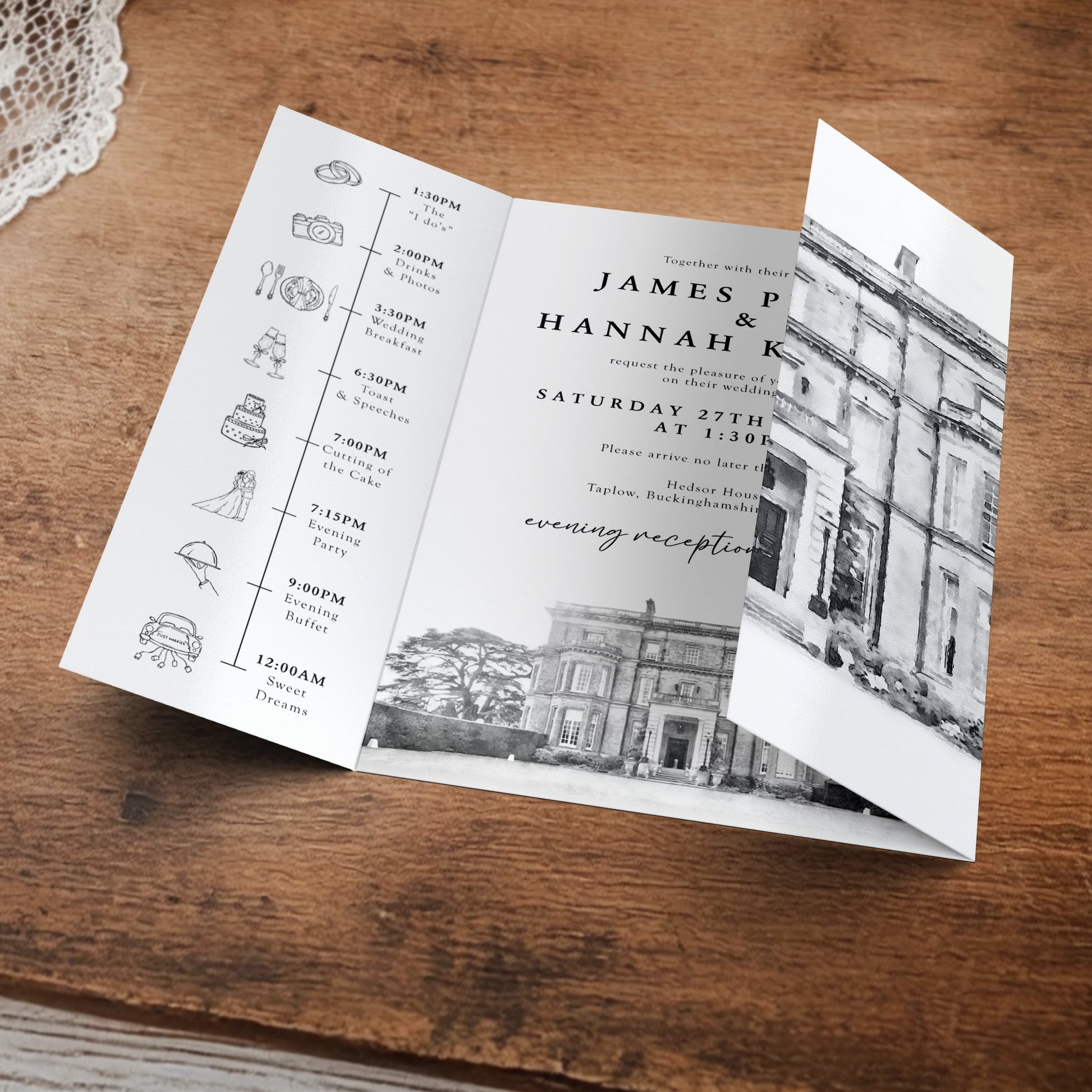 Black & White Gatefold Wedding Invitation with Belly Band & Custom Venue Sketch