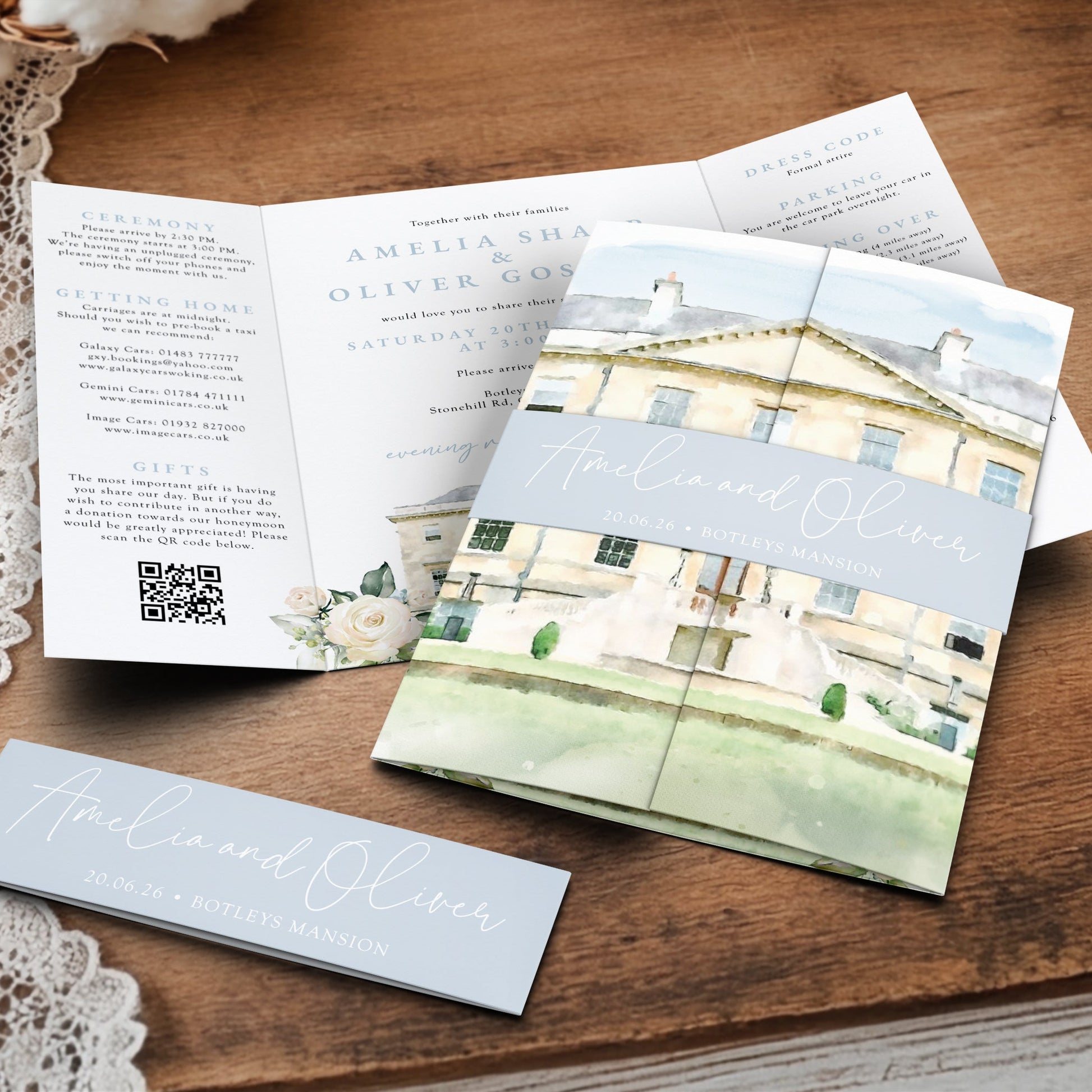 Elegant Dusty Blue Gatefold Wedding Invitations | Belly Band & Custom Venue Illustration