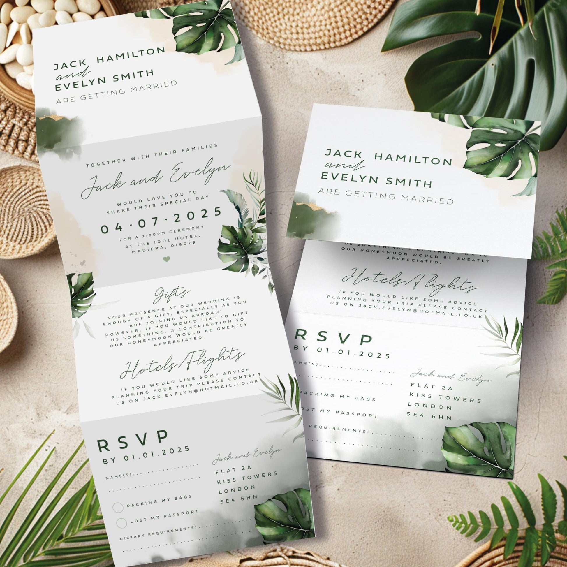Make your dream beach wedding unforgettable with our tropical destination wedding invitations! Featuring elegant palm leaves and coastal-inspired designs, these invitations set the perfect tone for your summer wedding by the sea. Customise with your details and impress your guests with a stylish, high-quality invitation suite.