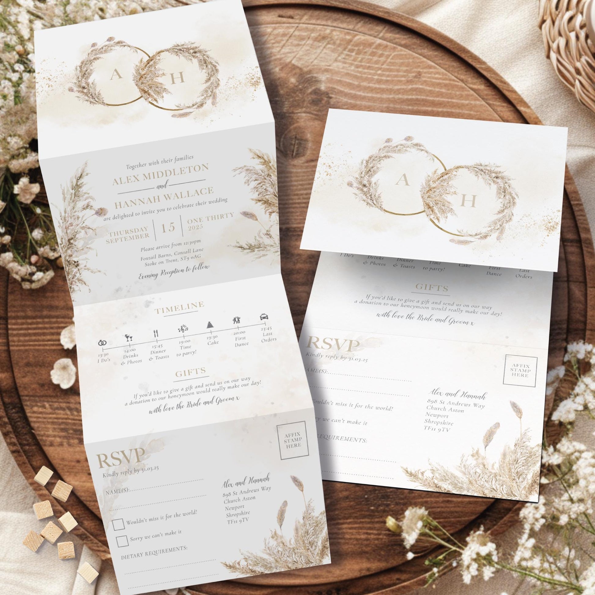 Bring effortless elegance to your wedding with our neutral pampas grass wedding invitations. Featuring soft, natural tones and delicate pampas grass illustrations, this timeless design is perfect for boho, rustic, modern, or neutral-themed weddings.