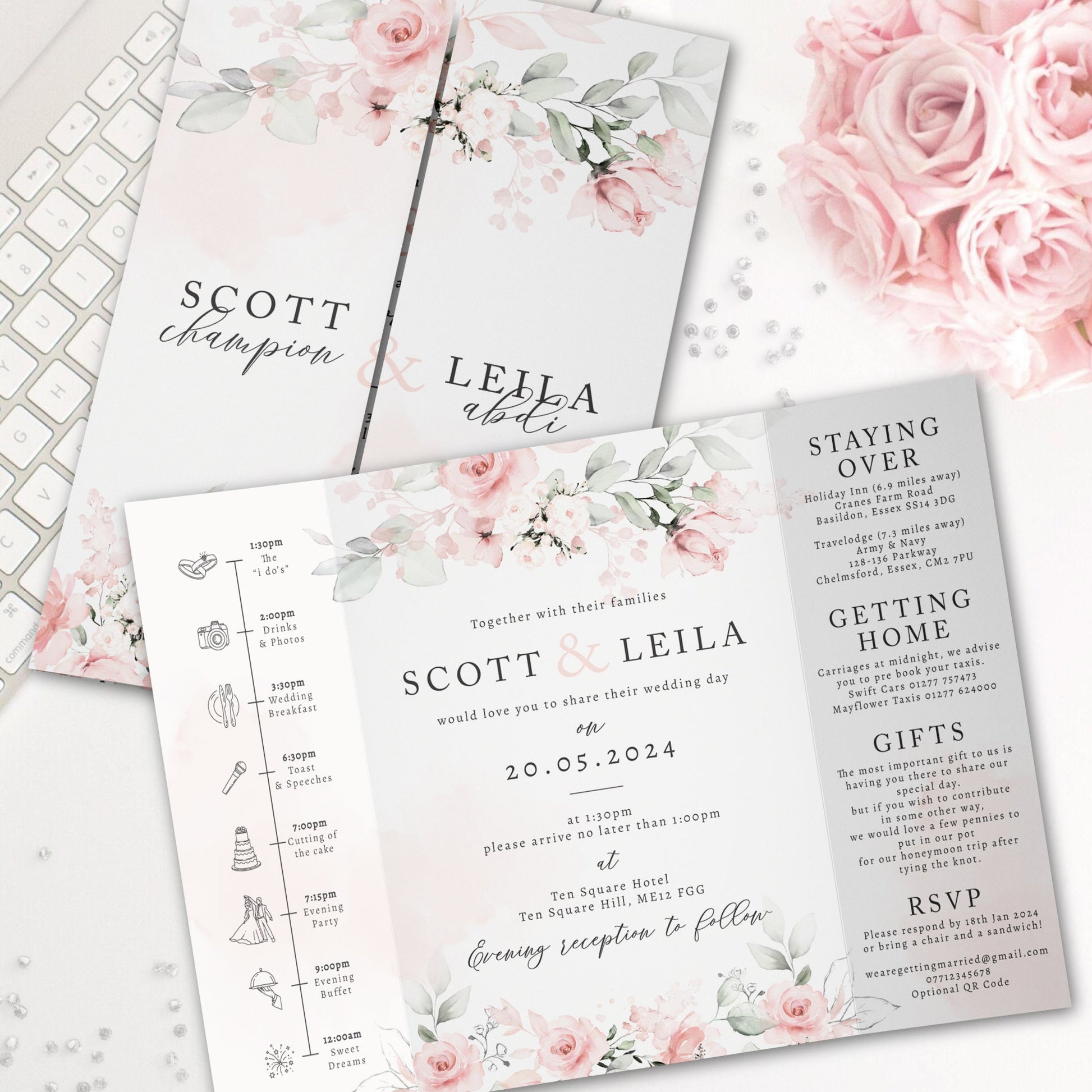 Blush Floral Wedding Invitation, Pink Rose Gatefold Wedding Invitations, Luxury Folded Wedding Invite, With Timeline Wedding Invitation