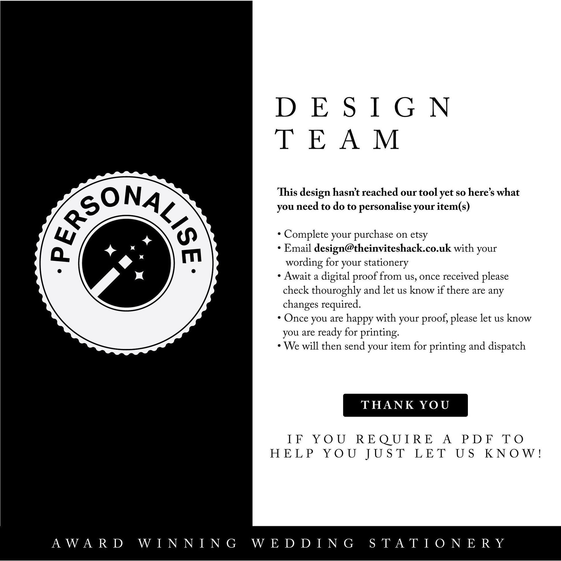Once you have placed the order contact us via email with your information. We just need the venue name, and we will locate the best image online to create your venue sketch from. Let us know if you require a pdf to help you with the information. Our graphic design team will then get started on your order and make any changes required for you. You will be sent a digital proof when your design is ready for your approval. Our email to send your wording is design@theinviteshack.co.uk.