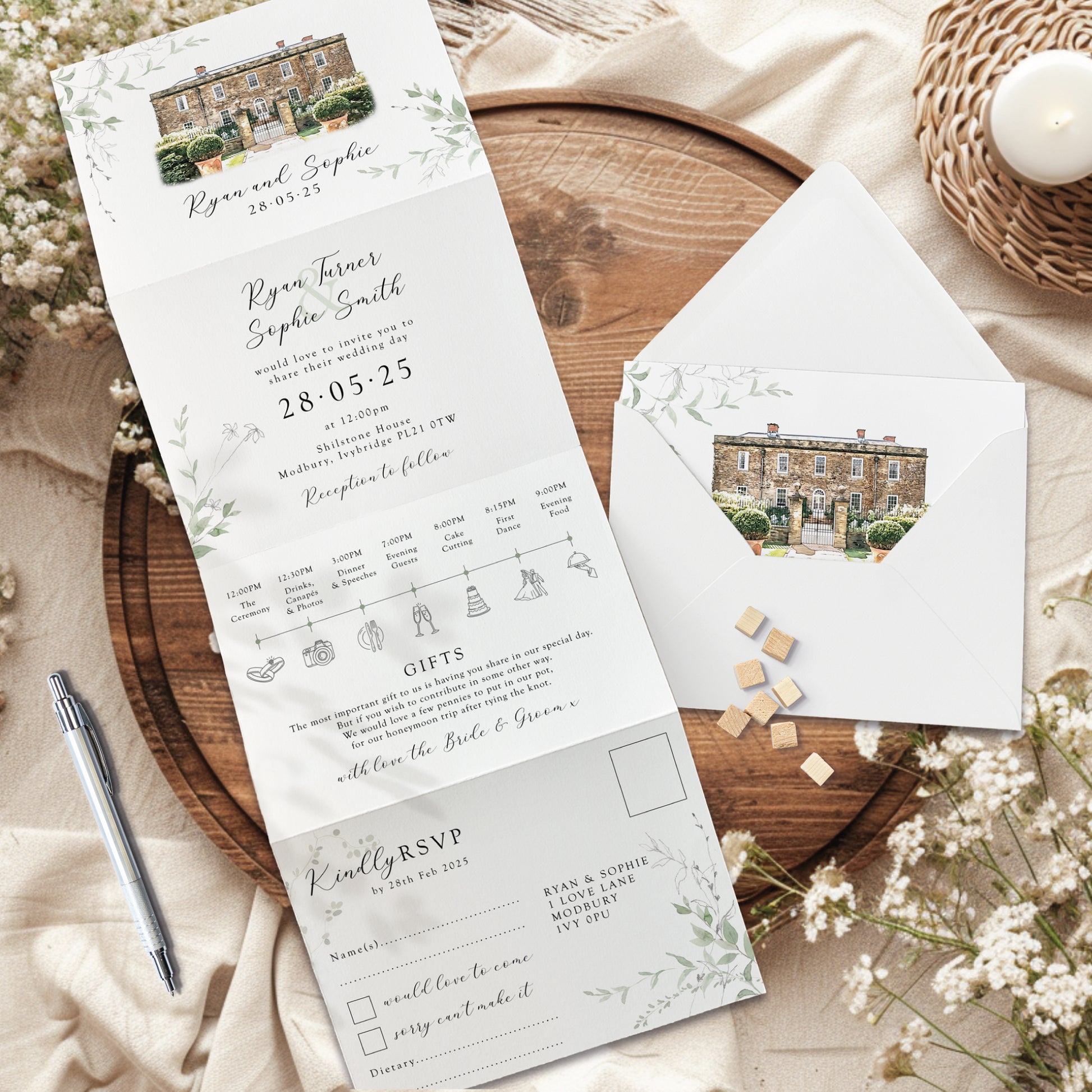 All-in-One Wedding Invitations with Venue Sketch & Greenery