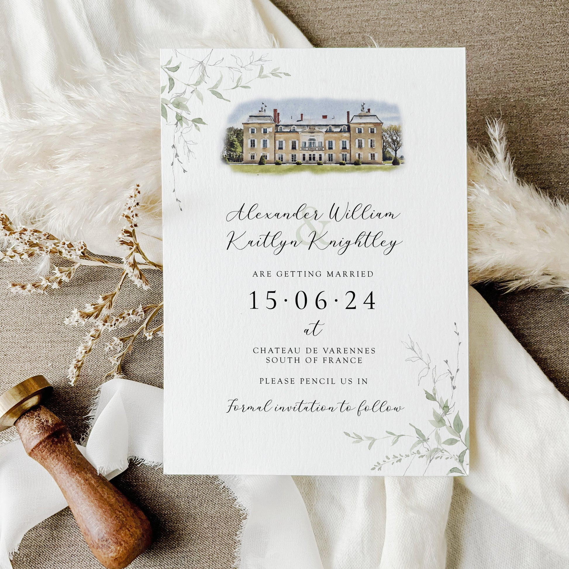 Venue Painting Save The Date with foliage, Wedding Save The Date Venue Sketch