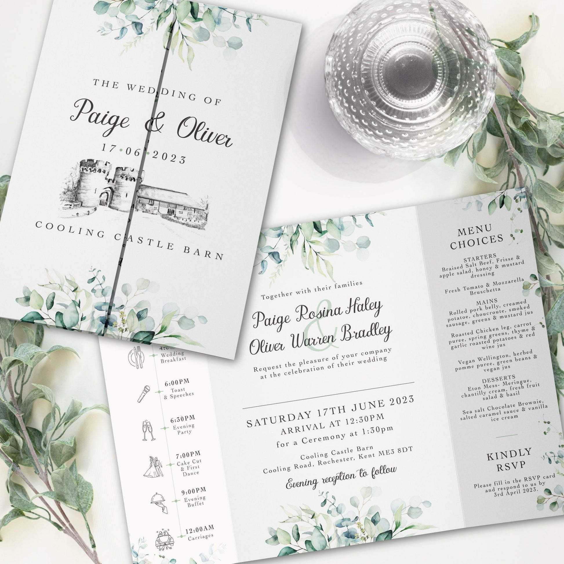 Create a timeless first impression with our wedding invitations featuring elegant eucalyptus foliage and a venue sketch of your wedding venue. Perfect for rustic, botanical, and modern weddings, this design combines natural greenery with meaningful illustration, making your stationery both personal and unique.
