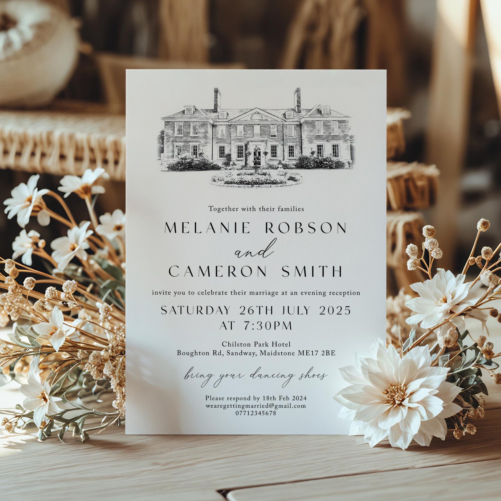 Celebrate your special day with these minimalist black and white venue sketch wedding invites, perfect for an elegant evening wedding. Featuring a custom venue illustration, these invitations add a personal touch to your wedding suite while maintaining a clean, modern aesthetic.